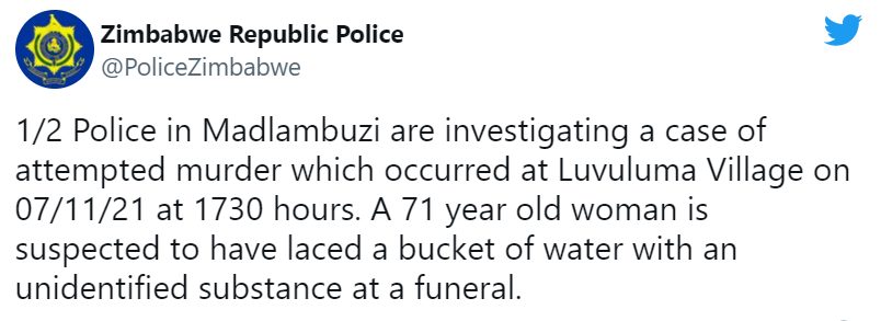”Police in Madlambuzi are investigating a case of attempted murder which occurred at Luvuluma Village on 07/11/21 at 1730 hours. A 71 year old woman is suspected to have laced a bucket of water with an unidentified substance at a funeral.