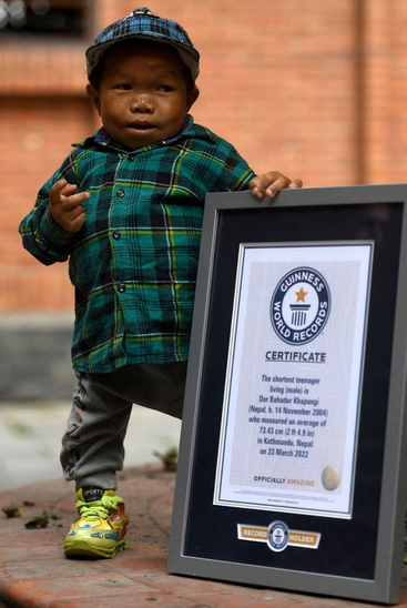 Dor’s Guinness World Records certificate reads: “The shortest teenager living (male) is Dor Bahadur Khapangi (Nepal, b. 14 November 2004) who measured an average of 73.43cm (2ft 4.9in) in Kathmandu, Nepal on 23 March 2022.”