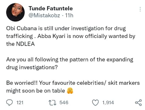 So some twitter users have been tweeting about how Abba Kyari and Obi Cubana are close and are saying, maybe what the former super cop was arrested for is what the socialite does. And to think he is still under investigation by the NDLEA.