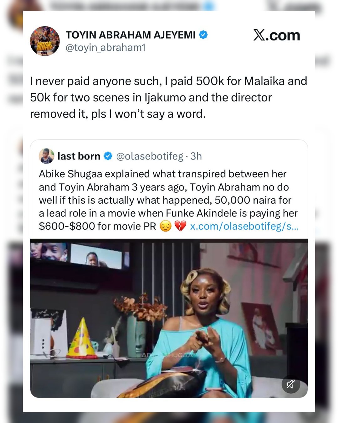 I was paid ₦50K but my scenes were removed” – Abike Shugaa shares disappointing experience with Toyin Abraham 🤷♀️🏃🏿♂️➡️ pic.twitter.com/z48SDkkbSw