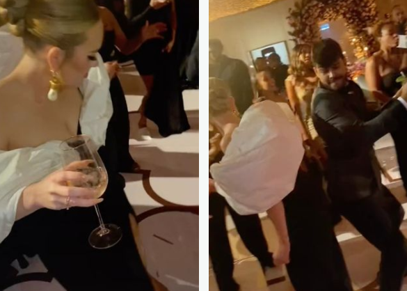 In a series of videos from the star-studded bash, Adele can be seen taking to the dancefloor while holding a glass of wine and dancing enthusiastically.