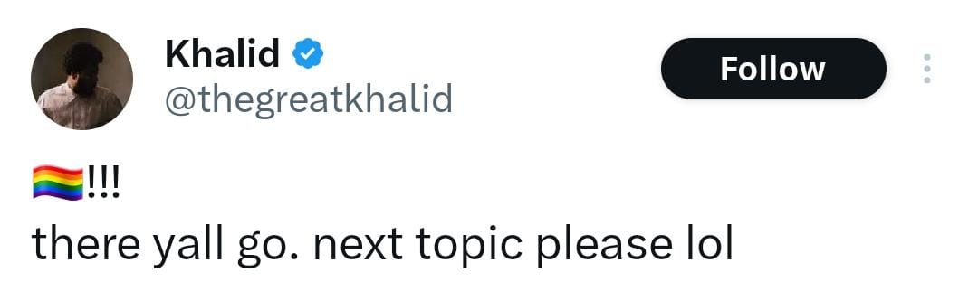 In response, Khalid posted a rainbow flag emoji with the caption, “There y’all go. Next topic please lol.” When a fan asked if he was gay, he simply replied, “I am! And that’s okay.”