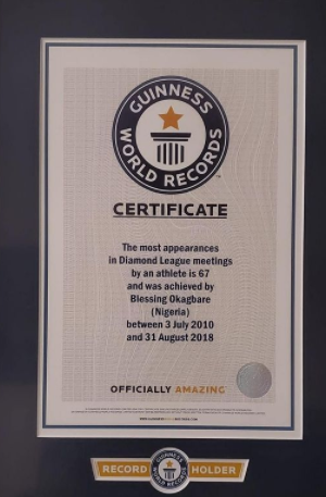Nigerian Olympics silver medalist, Blessing Okagbare has made it into the Guinness Book of World Records as she has attended the Athletics Diamond Meetings 67 times.