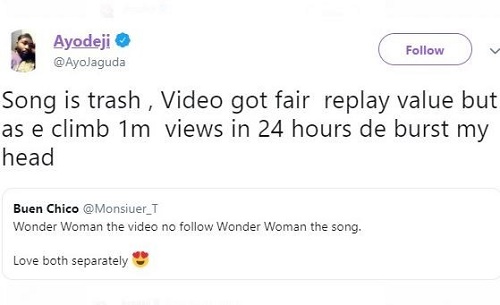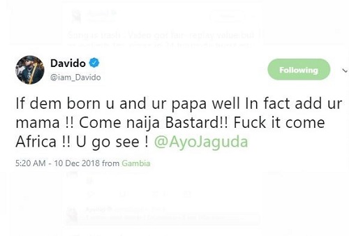 Davido has threatened one Ayo who is the Editor and creative writer at Jaguda.com for implying his wonder woman video hitting one million views in a day on youtube was bought! A very upset Davido then replied him saying, if dem born him papa well, infact him mama join sef, make him come Africa. Ayo’s tweets and Davido’s response all after the cut…