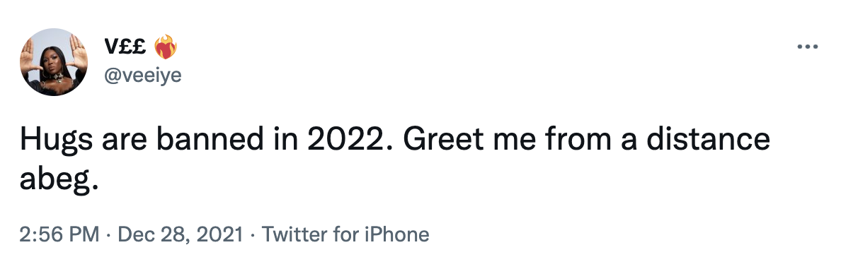 “Hugs are banned in 2022. Greet me from a distance abeg, she wrote ”