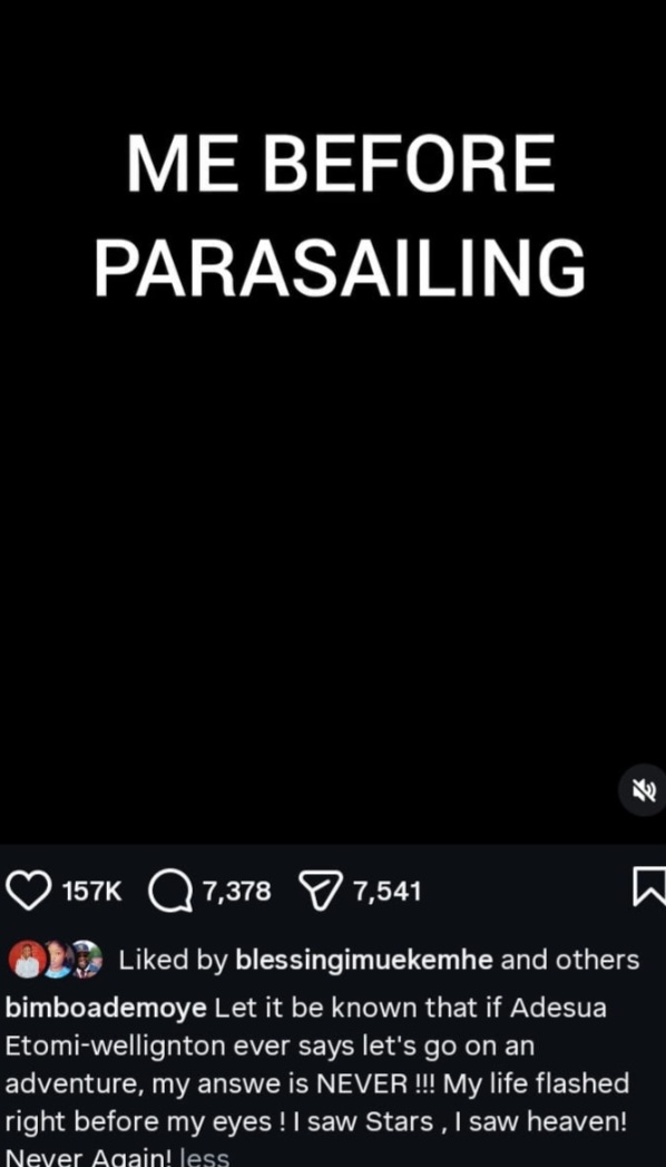 “Let it be known that if Adesua Etomi-Willington ever says let’s go on an adventure, my answer is NEVER!!! My life flashed right before my eyes! I saw Stars, I saw heaven! Never Again!”