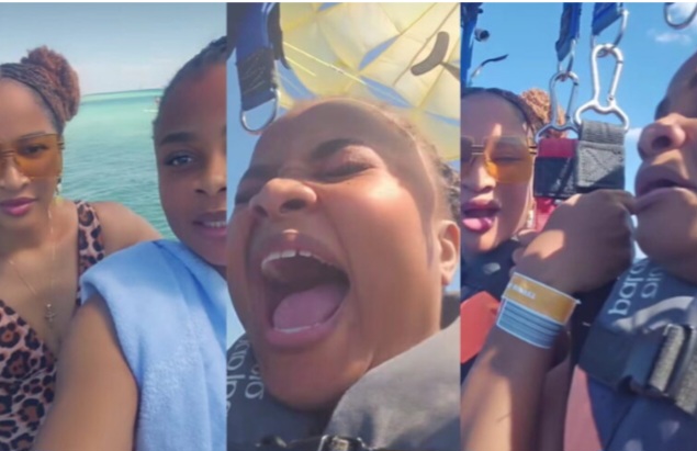 Nollywood star Bimbo Ademoye recently got a sky-high reality check while para-sailing with her colleague and friend Adesua Etomi-Wellington.