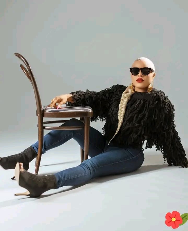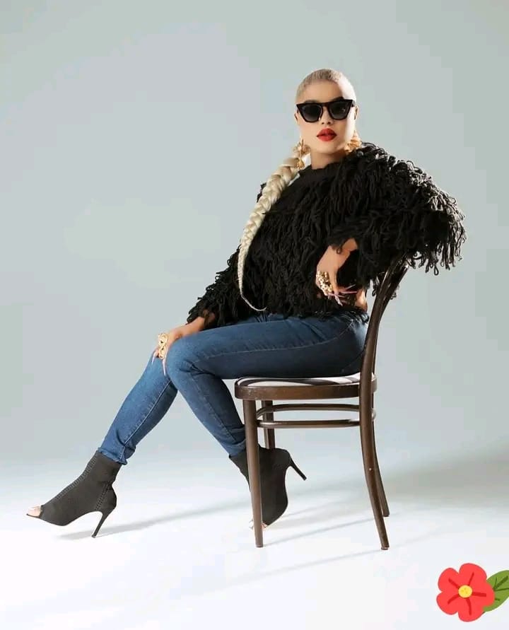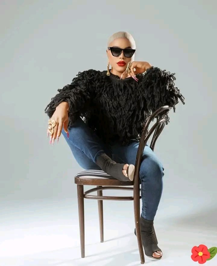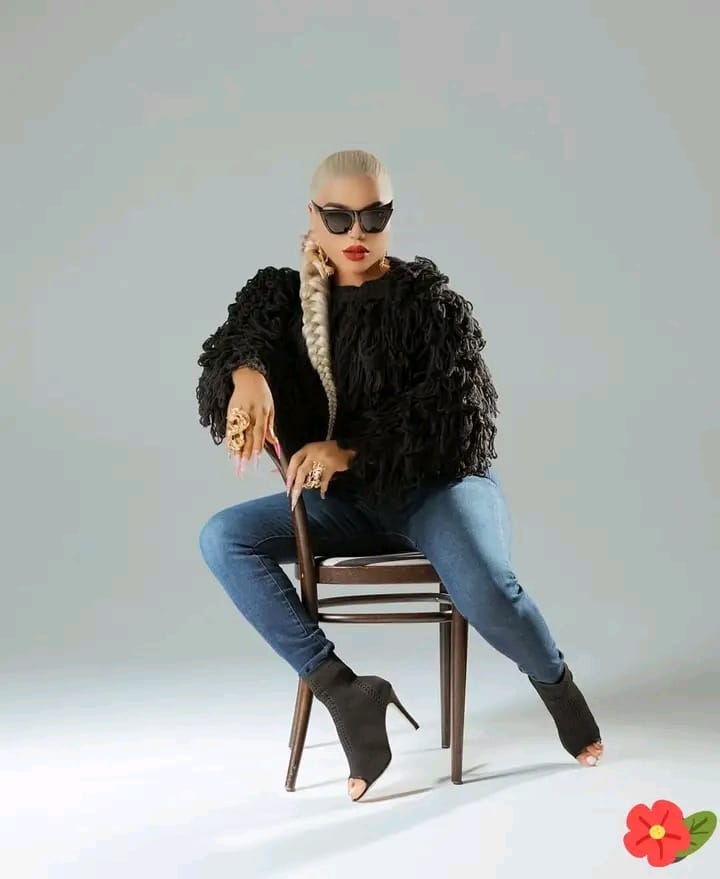Bobrisky exudes confidence in a black textured shaggy top, paired with blue fitted jeans and black open-toe high-heeled boots.