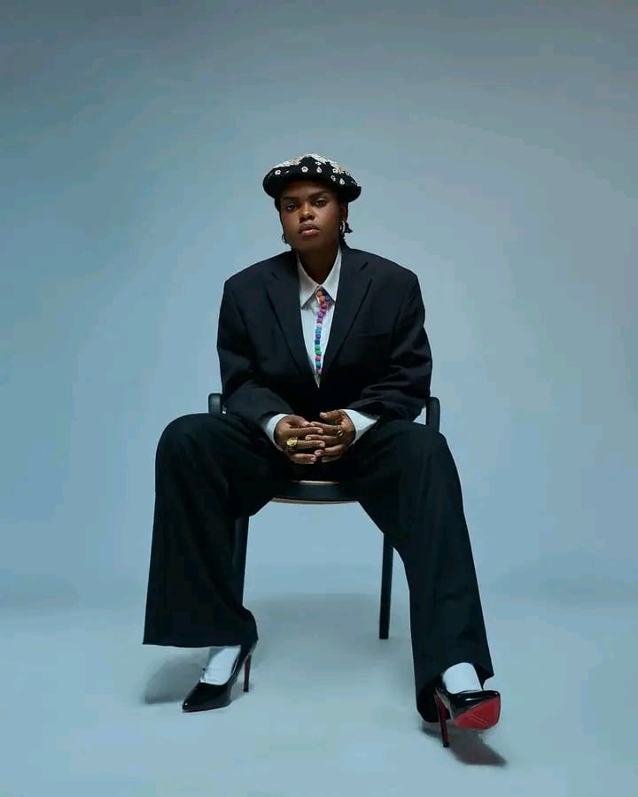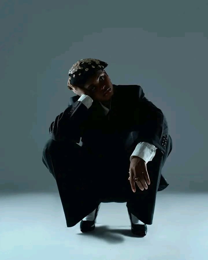 Jarvis, on the other hand, embraces a striking androgynous aesthetic in an oversized black suit with wide-leg trousers, a crisp white collared shirt, and a colorful tie.