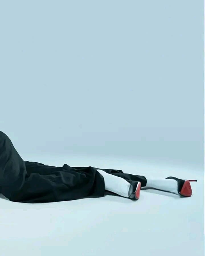 Adding a daring touch, she wears white socks with mismatched high heels—one black and one red—creating a bold fashion moment.