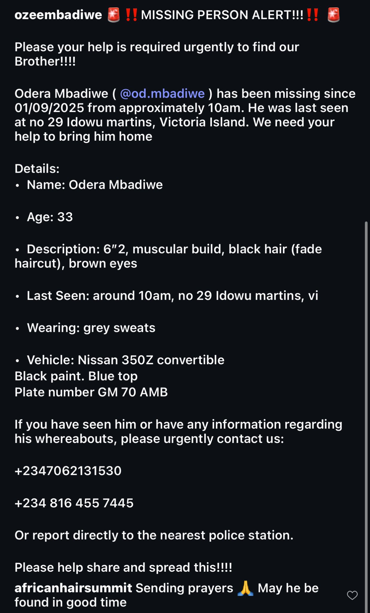 In posts shared on their Instagram accounts, the twins pleaded for the public’s assistance, stating that Odera has been unaccounted for since 10:00 AM on September 1, 2025. He was last seen at No. 29 Idowu Martins, Victoria Island, Lagos.