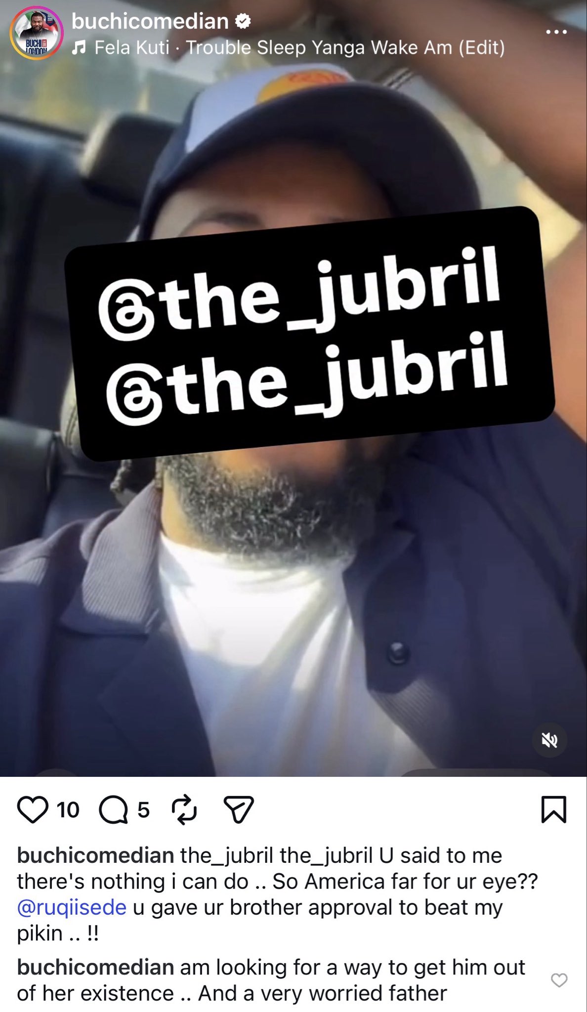 “the_jubril the_jubril U said to me there’s nothing i can do .. So America far for ur eye?? @ruqiisede u gave ur brother approval to beat my pikin .. !!”