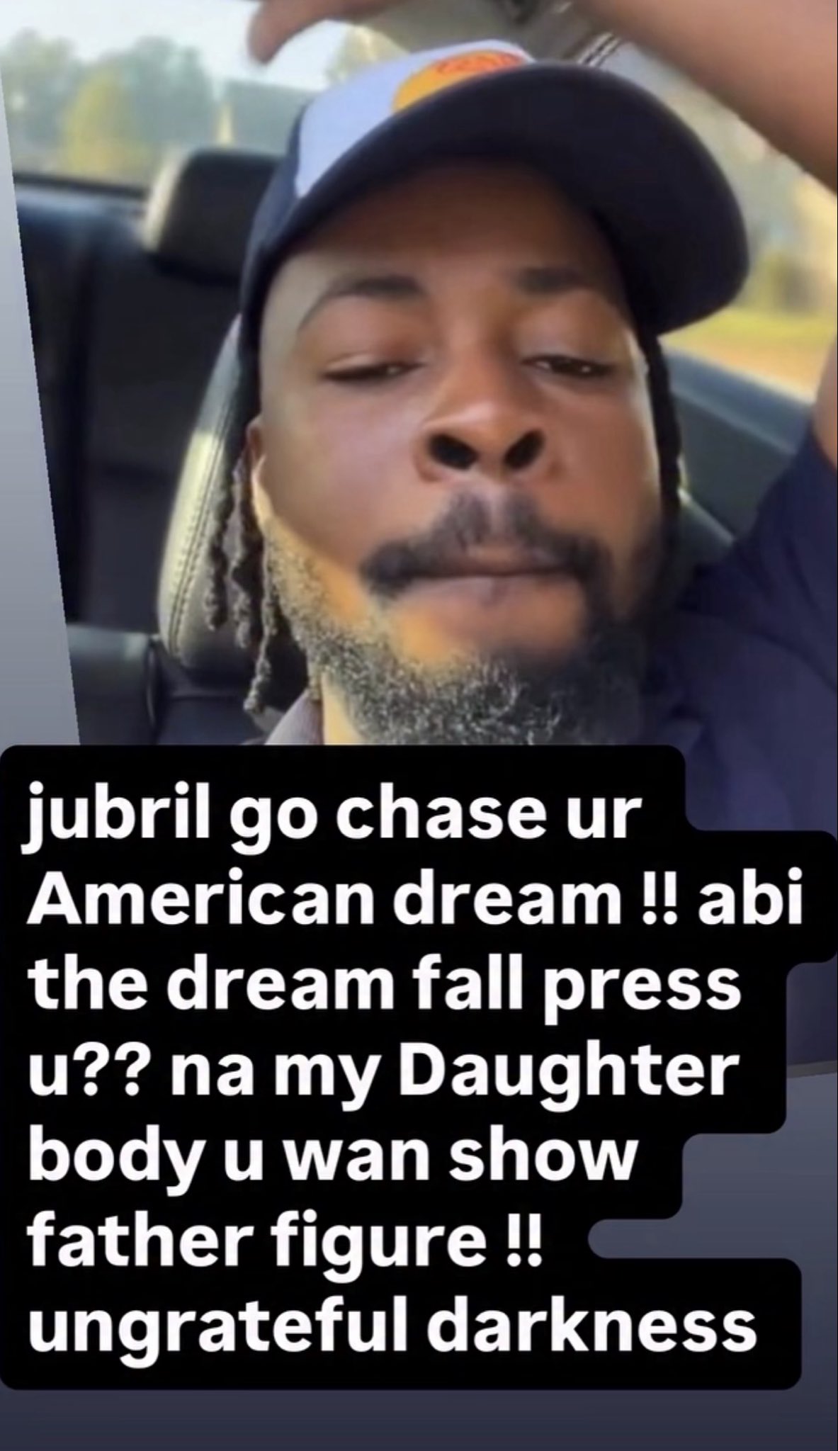 “jubril go chase ur American dream !! abi the dream fall press u?? na my Daughter body u wan show father figure !!”
