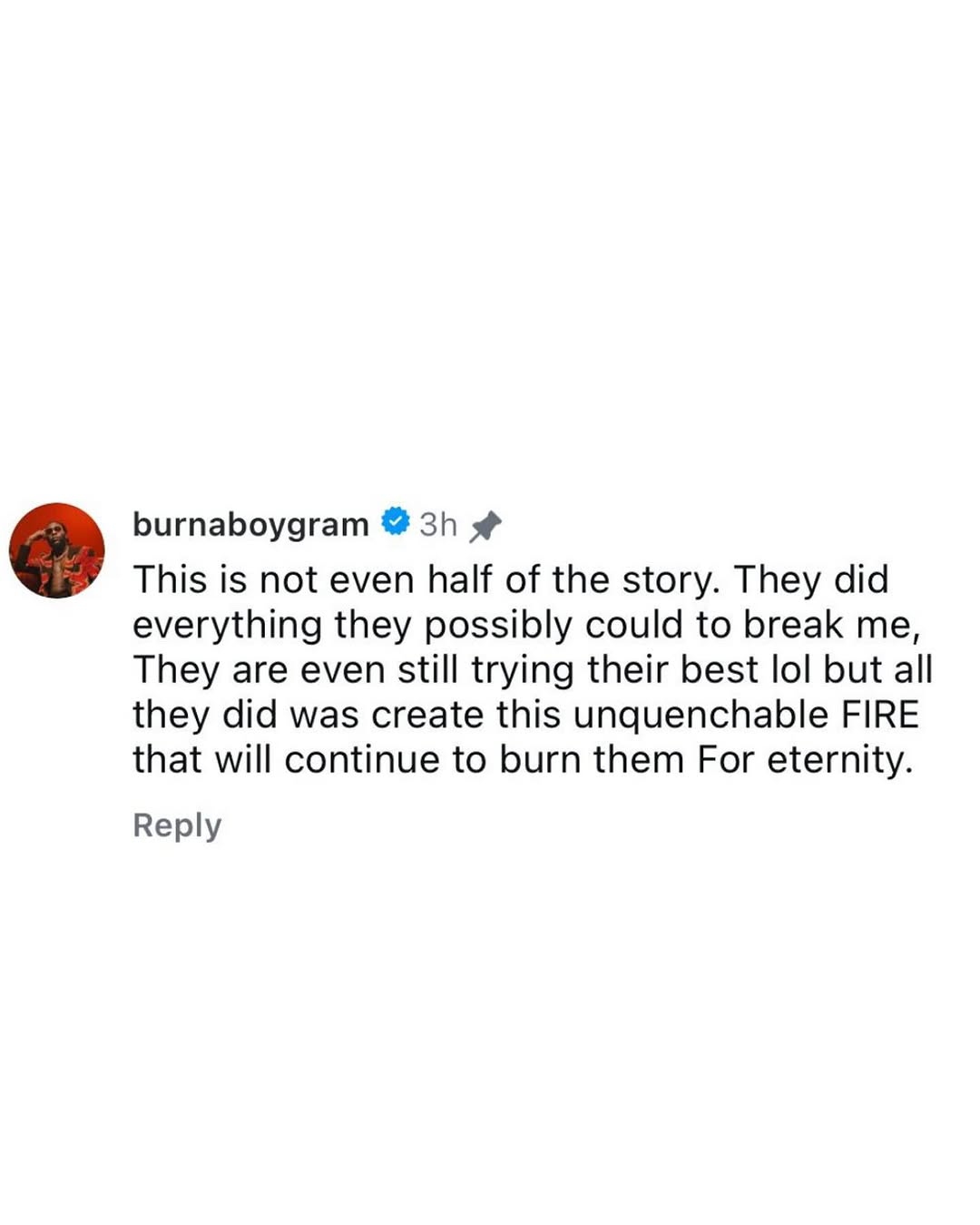 “This is not even half of the story. They did everything they possibly could to break me. They are even still trying their best lol. But all they did was create this unquenchable FIRE that will continue to burn them for eternity,” Burna Boy wrote.