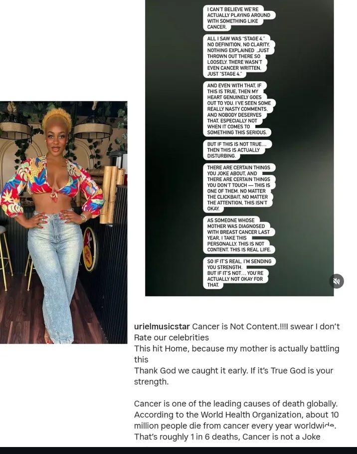 In an emotional outburst shared online, Uriel condemned what she described as the careless use of such a serious condition, questioning the lack of clarity in Blessing’s statement. She pointed out that the post only mentioned “stage 4” without clearly stating cancer or providing any proper explanation.