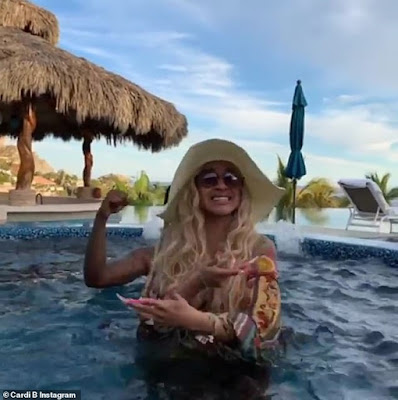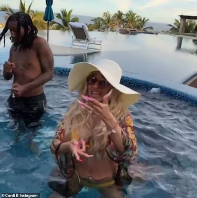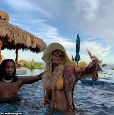 The talented couple danced and lip-synced to their hit collaboration Clout, with Cardi showing off her curves in a tiny yellow bikini.