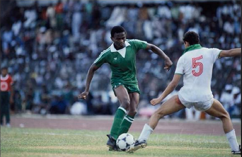 Adokiye Amiesimaka, the former Attorney General of Rivers State was one of the first graduates to play football for Nigeria. As seen in the photo above, Adokiye is pictured playing for Nigeria against Algeria in 1980.