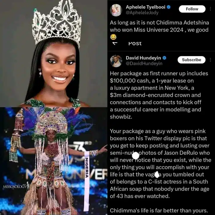 David revealed her mouth-watering reward when an X user bashed in on the Beauty Queen.