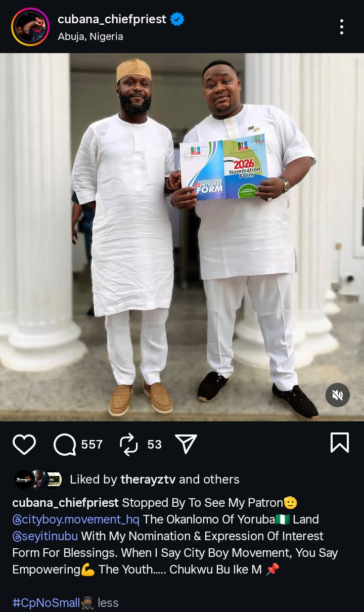 Cubana Chief Priest has formally obtained the All Progressives Congress (APC) nomination and expression of interest forms to contest for a seat in the House of Representatives for the Orsu/Orlu/Oru East Federal Constituency in Imo State