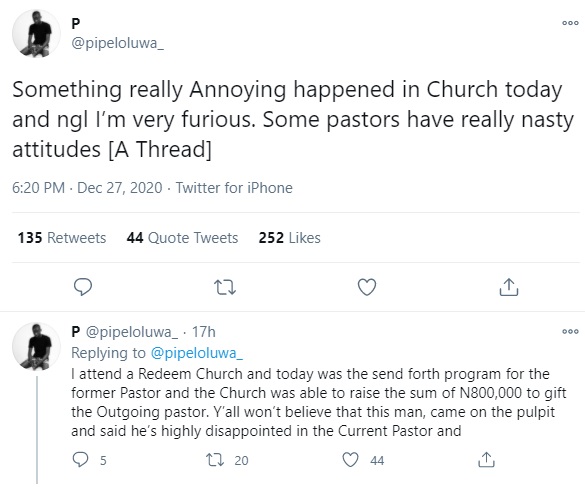 ”I attend a Redeem Church and today was the send forth program for the former Pastor and the Church was able to raise the sum of N800,000 to gift the Outgoing pastor. Y’all won’t believe that this man, came on the pulpit and said he’s highly disappointed in the Current Pastor and