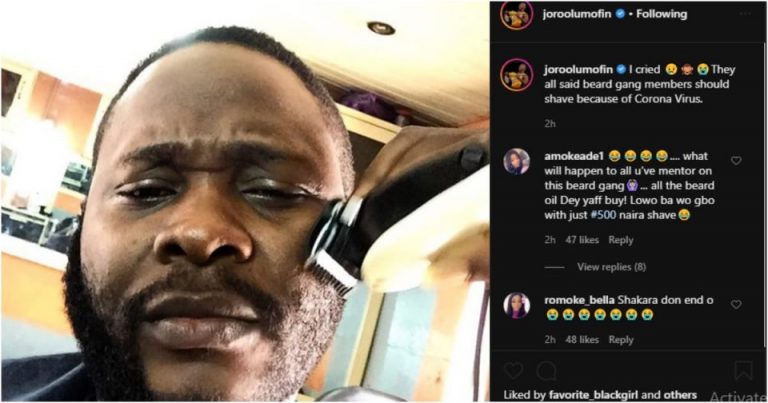 Joro Olumofin, a relationship expert has shaved his beards due to fear of coronavirus. Mr Olumofin shared a photo of himself at the barbing salon taking it all off/