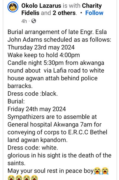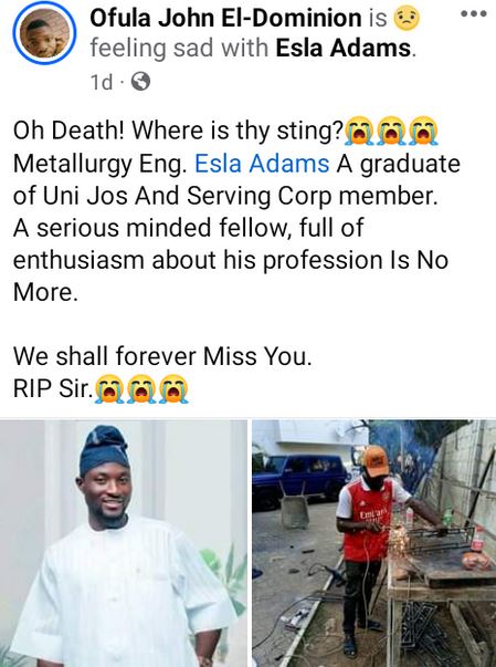 “Bro Esla Adams, I am so speechless hearing about ur demise after all the years in University of Jos a current serving corp member preparing for ur marriage introduction 26th of this month. You are no more yesterday. ahhhh what a world. We just meet in lafia on Sunday, Monday u are no more. Tor we can’t question God. May soul find rest in Bossom of our Lord Jesus Christ,” one Comr Simon Lukeson wrote.