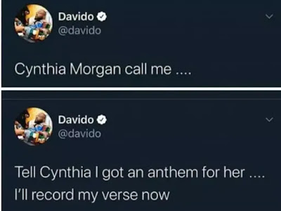 Recall Cynthia Morgan had said she was bankrupt and launched a GoFundMe project for her musical comeback. During that period, Davido in a tweet, asked Cynthia Morgan to call him as many speculated that Davido might help her get back in to the music industry.