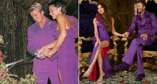 David & Victoria Beckham celebrate 25th anniversary wearing their purple wedding outfits