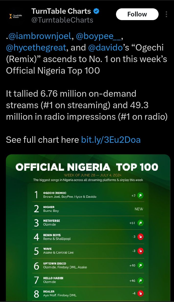 After Davido’s involvement, the “Ogechi” remix reached number one on the TurnTable Nigeria Top 100 chart for the week of June 28 – July 4, 2024. The remix was released on June 26, just a day after Davido’s widely-discussed wedding.