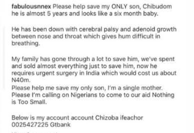 According to the sick boy’s mum; ‘please help save my ONLY son, Chibudom he is almost 5 years and looks like a six month baby’. He has been down with cerebral palsy and adenoid growth between nose and throat which gives hum difficult in breathing. My family has gone through a lot to save him, we’ve spent and sold almost everything just to save him, now he requires urgent surgery in India which would cost us about N40m, the post read.