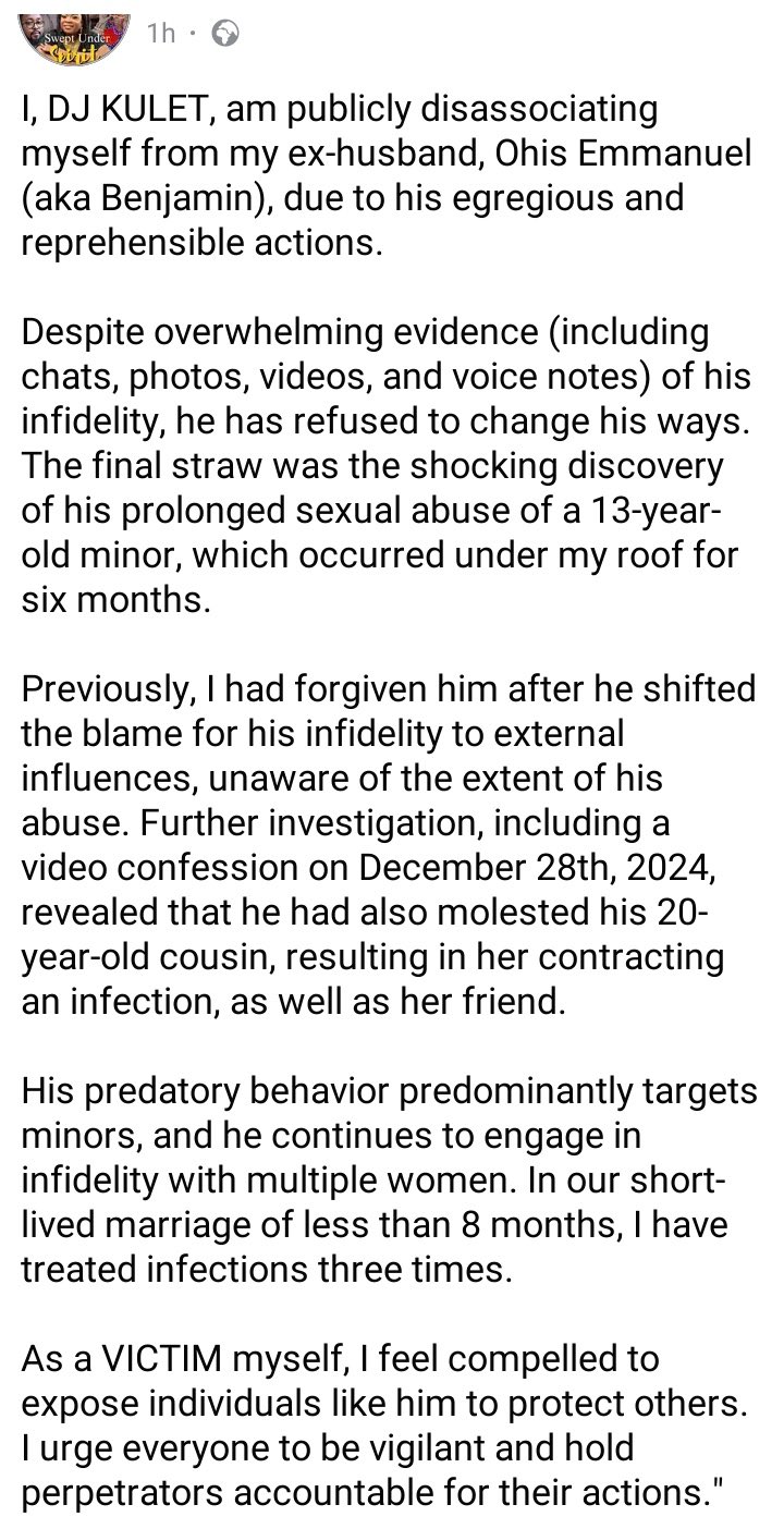 “I, DJ KULET, am publicly disassociating myself from my ex-husband, Ohis Emmanuel (aka Benjamin), due to his egregious and reprehensible actions.