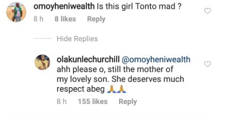 Churchill posted the above photo and asked his followers to caption it. As others gave their captions, this particular fan said something different – is this girl Tonto mad? Churchill then cautioned him saying she remains the mother of his child. Replying another fan again, the businessman said Tonto will be alright last last.