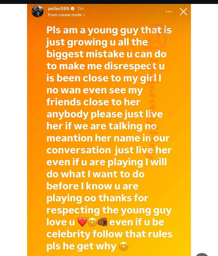 “Please, I’m a young guy that is just growing. The biggest mistake you can make that will make me disrespect you is being close to my girl. I don’t even want to see my friends near her. Anybody, please just leave her alone. If we’re having a conversation, don’t even mention her name. Just leave her out of everything.”