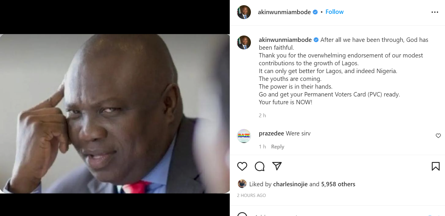 Ambode wrote: “After all we have been through, God has been faithful. Thank you for the overwhelming endorsement of our modest contributions to the growth of Lagos. It can only get better for Lagos, and indeed Nigeria. The youths are coming. The power is in their hands. Go and get your Permanent Voters Card (PVC) ready. Your future is NOW!”