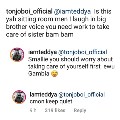 A Bam Bam’s fan has questioned Teddy A’s ability to take care of the reality star when they eventually tie the knot. Teddy A and Bam Bam got engaged last weekend. Teddy A had shared a photo of himself and friend in his living room when the fan asked if that was his place and if yes, he needs to hustle more in other to be able to take care of Bam Bam. Teddy A who wasn’t in the mood then fired back.
