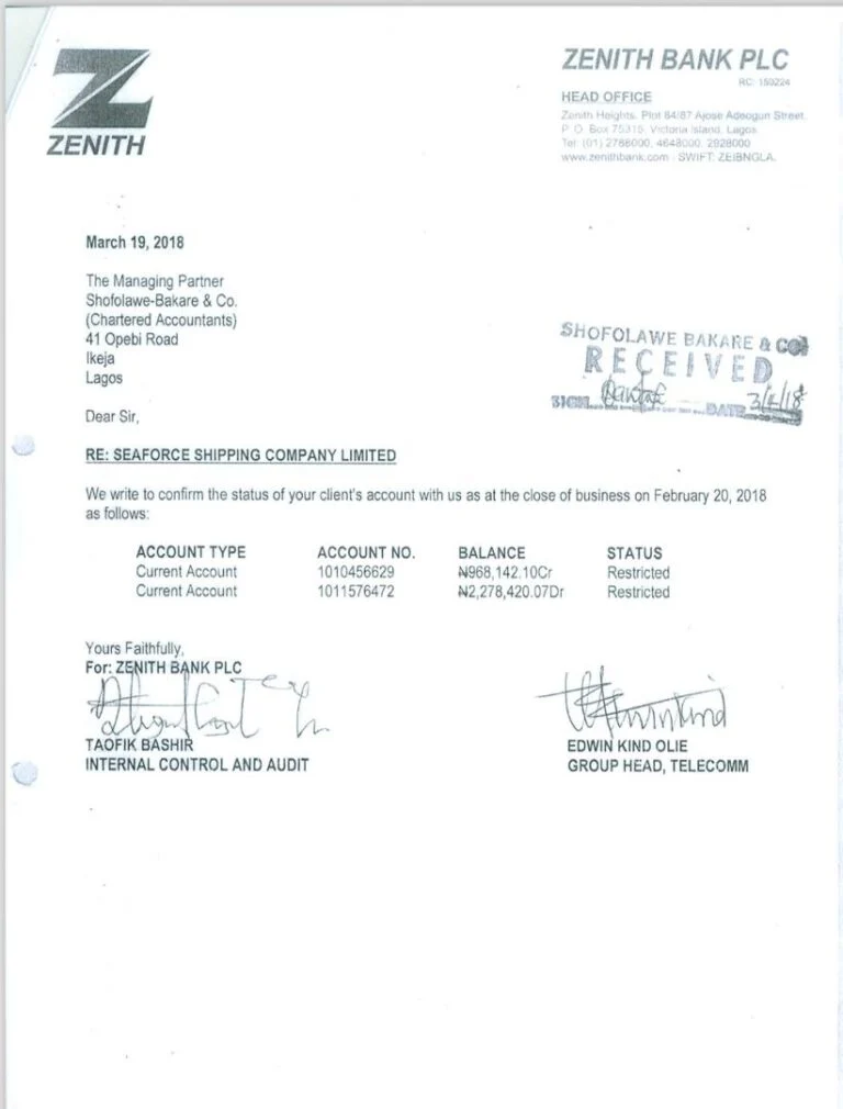 Otedola produced a letter written on March 19, 2018 by Zenith Bank to Shofolawe-Bakare & Co, Seaforce’s auditors, stating a debt of only N2,278,420 on the same account, as against the N5 billion recorded in the bank statement seen by TheCable.