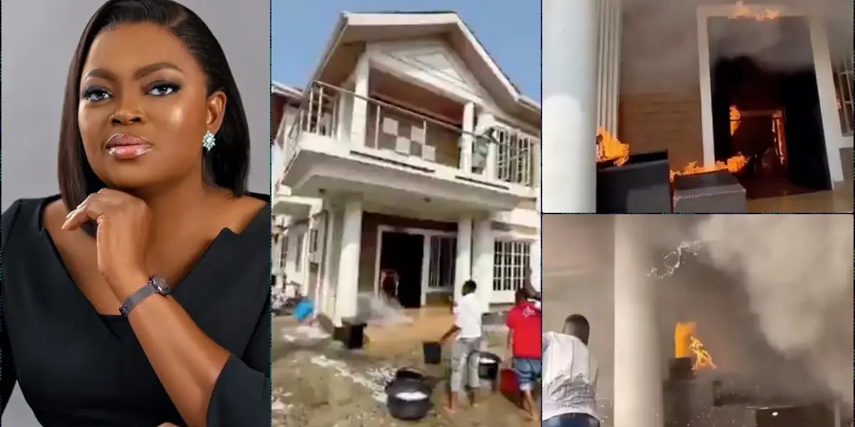A dramatic video from the set of Funke Akindele’s upcoming film, Everybody Loves Jenifa, has gone viral, showcasing a multimillion-naira mansion engulfed in flames