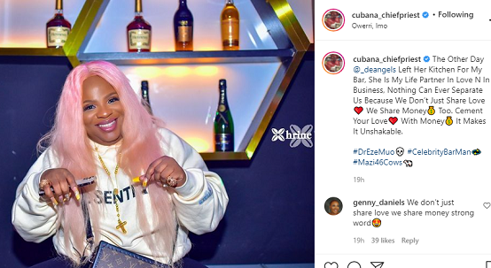 He wrote; The Other Day @_deangels Left Her Kitchen For My Bar, She Is My Life Partner In Love N In Business, Nothing Can Ever Separate Us Because We Don’t Just Share Love❤️ We Share Money💰 Too. Cement Your Love❤️ With Money💰 It Makes It Unshakable.