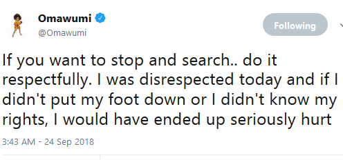 Nigerian singer, Omawumi early hours of this morning cried out on social media saying she was disrespected by the Nigerian police this morning. She spoke about ‘stop and search’, so we guess it was when she was returning from AY’s Merry Men premiere this morning. Thank God she is fine. Her tweets below…