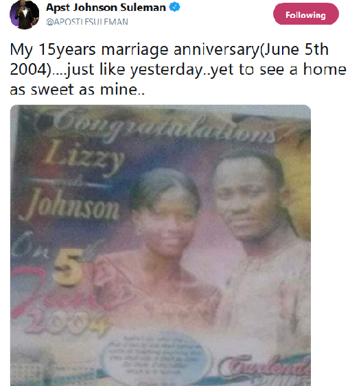 Apostle Suleman and wife, Lizzy are today, 5th of June, 2019 celebrating their 15 years wedding anniversary. The Apostle in his anniversary message however pointed he is yet to see a sweet home as his.