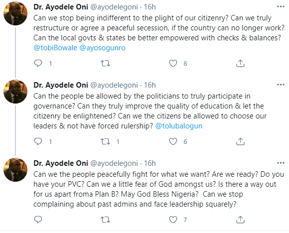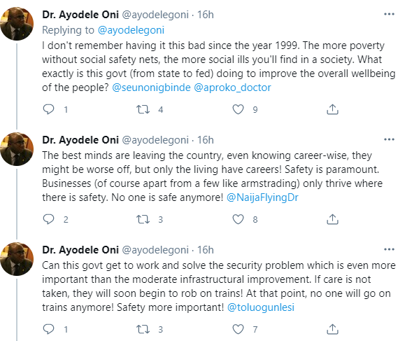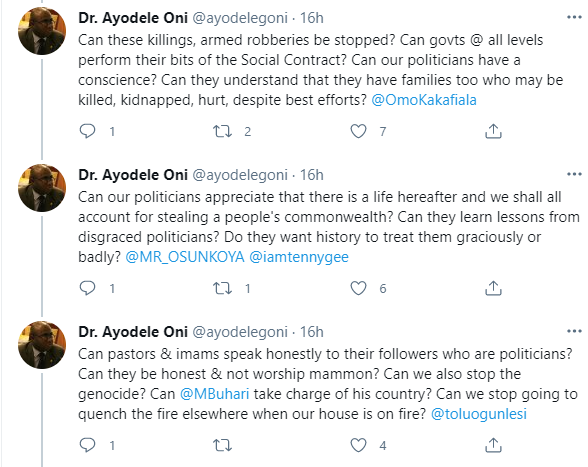 Businessman and Commercial Lawyer, Dr. Ayodele Oni has spoken about the high rate of insecurity in Nigeria. According to him, on Sunday afternoon around 2pm, robbers entered a barbers shop and disposed everyone of their belongings.