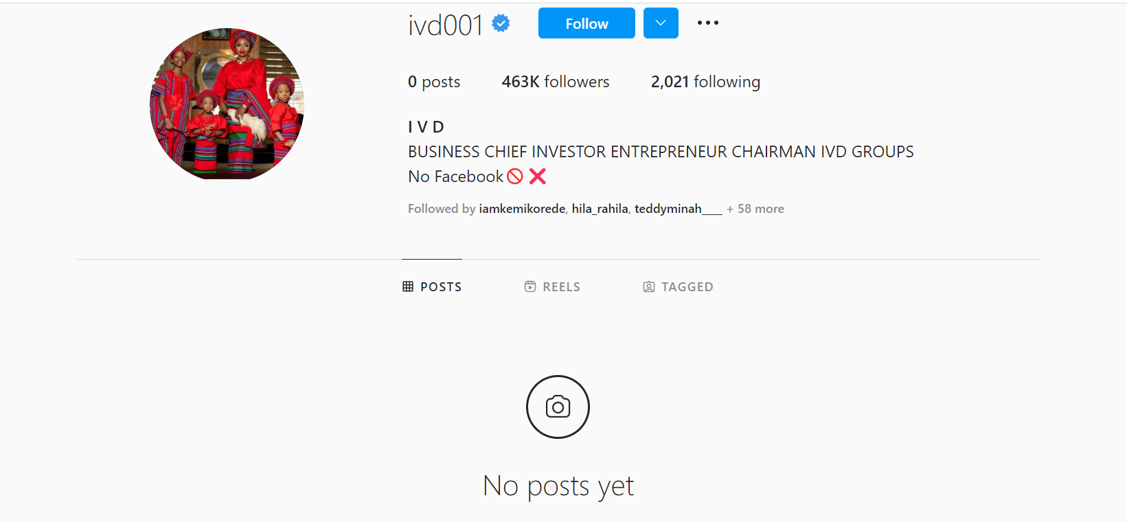 Celebrity auto-dealer, Ikechukwu Ogbonna popularly known as IVD has changed his Instagram DP to that of his late wife, Bimbo and their children.
