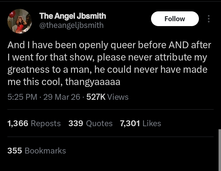 “And I have been openly queer before AND after I went for that show, please never attribute my greatness to a man, he could never have made me this cool, thangyaaaaa.”