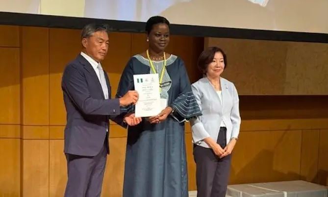 Nigeria’s Chargé d’Affaires in Japan, Florence Akinyemi Adeseke, alongside Kisarazu Mayor Yoshikuni Watanabe, was presented with a certificate naming the city the “hometown” of Nigerians.
