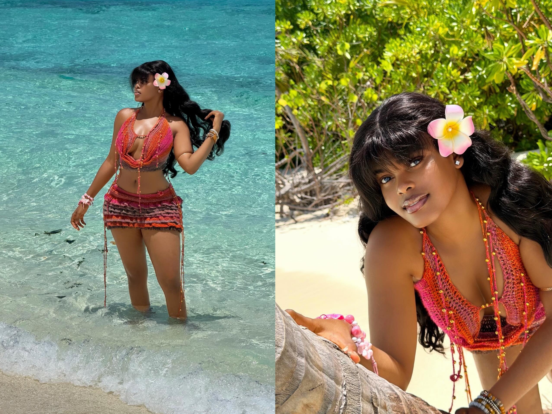 In the stunning shots, Jarvis is seen embracing a tropical, island-girl aesthetic in a pink-orange crochet halter top paired with a matching ruffled mini skirt adorned with beaded tassels.