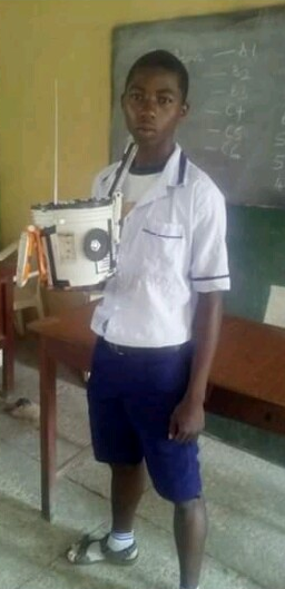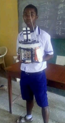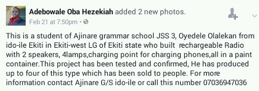 ‘This is a student of Ajinare grammar school JSS 3, Oyedele Olalekan from ido-ile Ekiti in Ekiti-west LG of Ekiti state who built rechargeable Radio with 2 speakers, 4lamps, charging point for charging phones, all in a paint container. This project has been tested and confirmed, He has produced up to four of this type which has been sold to people’