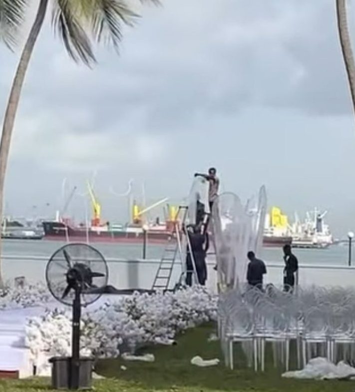 The white wedding took place at a luxurious seaside venue adorned with palm trees, floral arrangements, and a serene white aisle that set the tone for a romantic and stylish celebration.