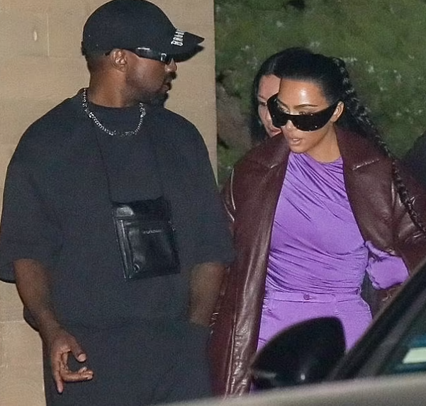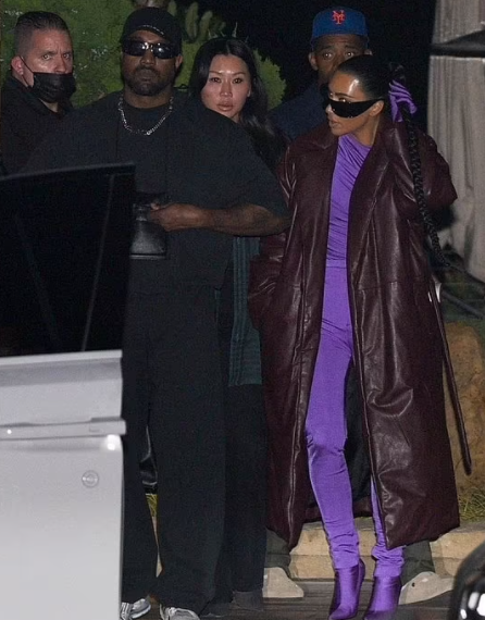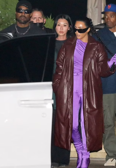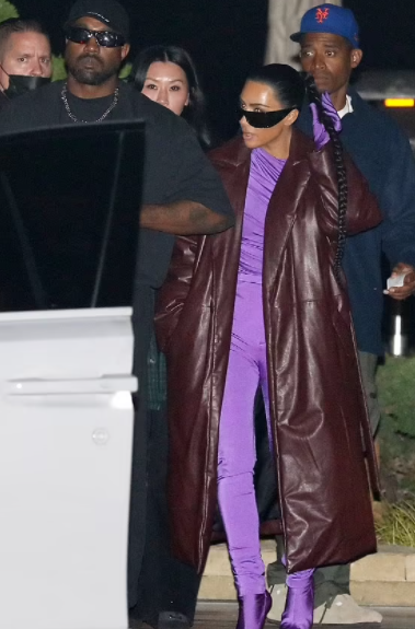 The reality star, 40, slipped into a skintight purple catsuit and a brown leather trench coat as she headed to the eatery with the rapper, 44.