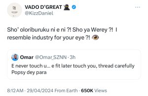Kizz Daniel has reacted after a fan warned him to thread carefully