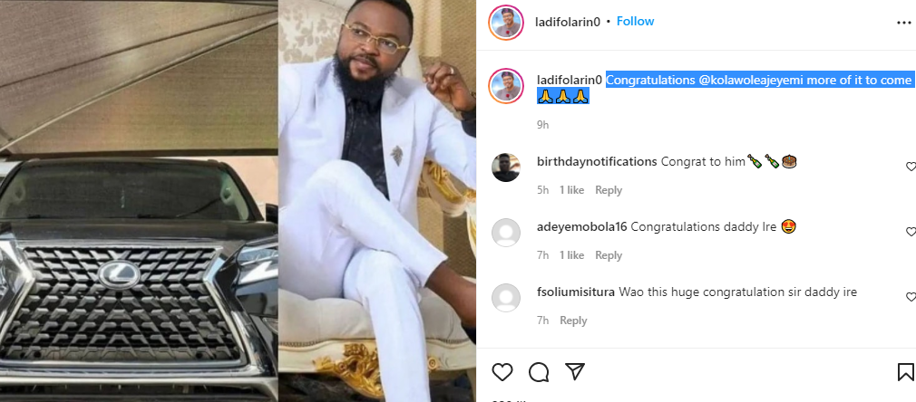 He was congratulated by actor, Ladi Folarin who shared a photo of the car on his Instagram page writing;